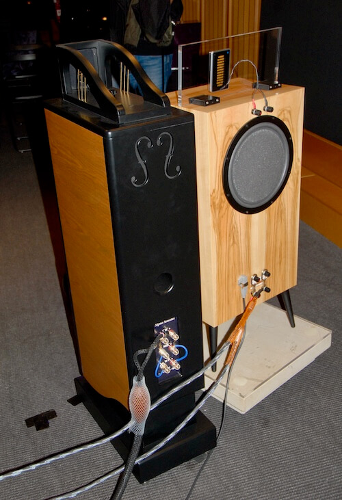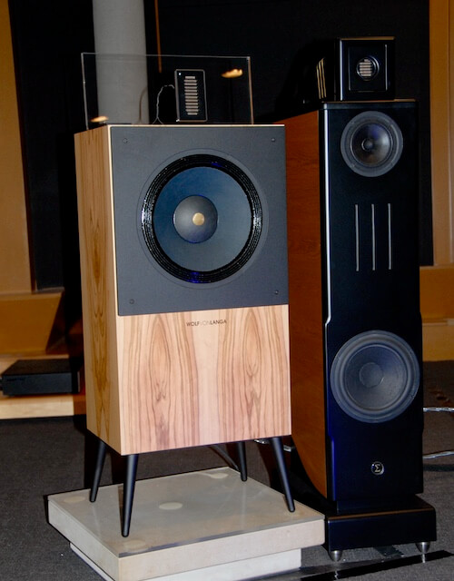 Como pueden ver, se trata de dos conjuntos que comparten componentes clave, lo que por otro lado constituye una garantía casi absoluta de rigor a la hora de evaluarlos. Pregunté acerca de la elección de los amplificadores y me respondieron que estaba determinada por la sensibilidad de las cajas acústicas asociadas, algo que me parece totalmente sensato si tenemos en cuenta las muy respetables dimensiones del espacio de escucha y la lógica exigencia de obtener niveles de presión realistas sin distorsión. Aunque, insisto, es el presente artículo la crónica sobre unas audiciones, me gustaría dar una pincelada al que sin duda era uno de los productos más “esotéricos” presentes en las mismas: las cajas acústicas WVL12639 SON de la alemana -bávara- WOLF VON LANGA. Sí, conozco la marca, pero nunca le había dedicado la atención debida, como suele ser el caso durante esa locura de certamen que es Munich High End, donde la sobreabundancia de propuestas hace que se dejen muchas en el “tintero”. De las cajas en cuestión les diré que son un sistema activo/pasivo de 2 vías basado en un principio habitual en los albores del audio de alta calidad -bautizado en este caso como FC-HRP- y que en los años recientes sólo había visto en las realizaciones de élite de Focal: el uso de un electroimán -en vez de un imán permanente- en el altavoz de graves, con lo que ello comporta en términos de complejidad técnica extra, y, en el plano práctico, de mayor precisión en el control del movimiento del diafragma.