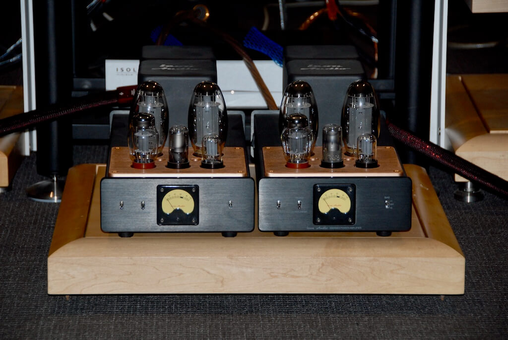 En lo que respecta al “músculo” de nuestro equipo, los bloques monofónicos MB 90 MKII, hay que señalar que también utiliza una configuración 100% a válvulas y que puede funcionar en los modos Ultralineal -el elegido en nuestro caso- y Triodo, siendo la potencia continua disponible de 115 vatios y 60 vatios respectivamente con los espectaculares e inconfundibles tetrodos de salida KT150 de Tung Sol, que son precisamente los empleados en los amplificadores de nuestra sesión de escucha aunque pueden ser reemplazados, con las pertinentes modificaciones en la potencia entregada y/o el carácter tonal por KT120, KT88 o equivalentes. Acompañan a estos dispositivos dobles triodos 6SL7 en la primera etapa y 6SN7 en el divisor de fase, así como transformadores con devanados hechos a mano y núcleo de acero de grano largo de origen japonés, resistencias sobredimensionadas y condensadores de polipropileno de grado audiófilo, todo ello rematado por un montaje interno con soldaduras punto a punto y por tanto sin placas de circuito impreso. A los amantes de los datos técnicos les gustará saber que la respuesta en frecuencia anunciada por el fabricante es de 20Hz-20kHz, +/- 0’1dB, un registro poco habitual en amplificadores a válvulas “clásicos”.