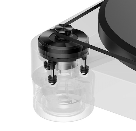 El plato acrílico de 20 mm del giradiscos es accionado por un motor controlado por un sensor óptico que garantiza una velocidad de rotación continua y precisa de 33-1/3 o 45 RPM. El motor está montado sobre casquillos de goma que amortiguan las vibraciones, diseñados para desacoplar el motor de la base, minimizando la transmisión de ruido mecánico y oscilaciones. Una fuente de alimentación conmutada externa aísla la conversión de CA a CC para evitar que añada interferencias eléctricas, y las patas de aislamiento con muelle y altura ajustable del giradiscos ofrecen una excelente protección contra el ruido externo.