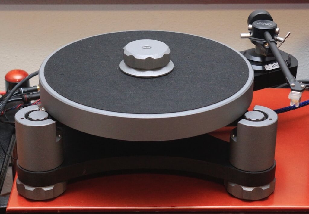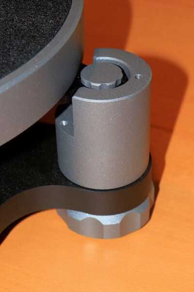Se trata de un plato no tan minimalista como el Ingenium, pues cuenta con una base mucho más elaborada, sujeta por tres grandes torres al estilo de los Acutus. Estas bases contienen en su interior la particular “suspensión” elástica de AVID, pues es un plato básicamente rígido: no se aprecia movimiento al mover el plato o subchasis, pero su sistema para evacuar y eliminar vibraciones está ahí. Las bases tienen unos grandes pies ajustables con una fina rosca que permite dejar el plato perfectamente plano (con ayuda de un buen nivel) una vez instalado en el mueble donde vayamos a usarlo. El subchasis es de material metálico de fundición y aspecto muy rígido mientras la base es más inerte.
