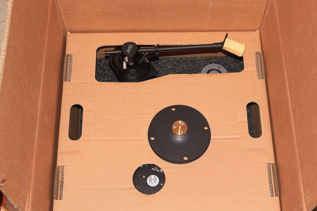 Desde que abrimos la caja y retiramos los manuales, lo primero es sacar también accesorios: el “clamp”, la alimentación del motor (y control de velocidad) y los cables y correas. Aquí podemos levantar el primer piso de cartón, no sin antes retirar el sub-platter que va solamente apoyado para el transporte, lo que nos deja ya a la vista lo principal del plato con su base, subchasis, y brazo (con cápsula en nuestro caso). Y lo podemos extraer, con cuidado que es la parte más pesada del conjunto, para llevarlo a la mesa donde lo queramos montar, o a su base ya en el mueble del equipo.