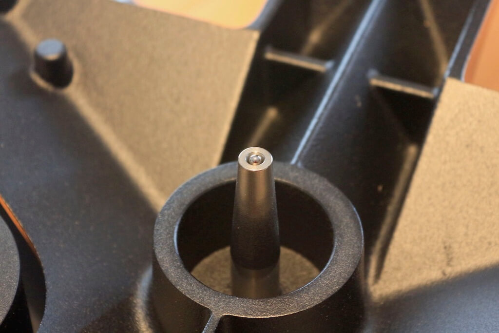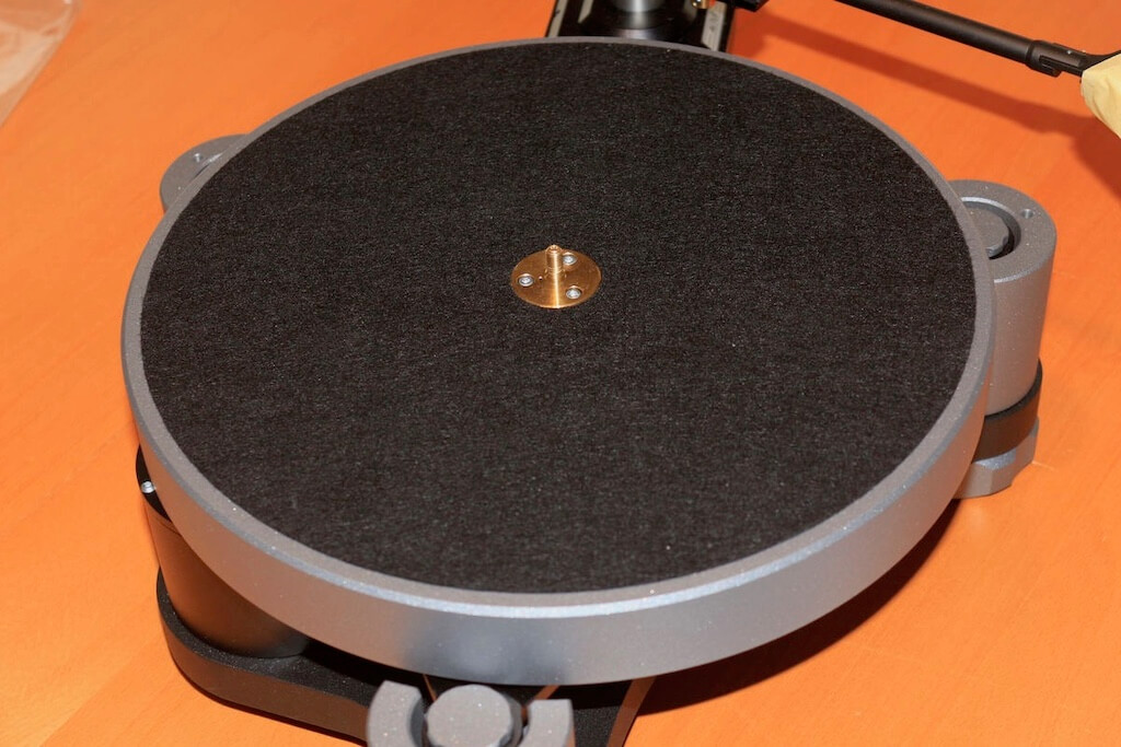 El motor va sobre la base pero queda integrado dentro (bajo el plato) como veremos, y acciona el sub-platter a través de dos correas. Ese platter gira sobre un cojinete que nos recordó mucho, si no es el mismo, que el del Ingenium: casquillo de bronce sobre acero, con apoyo sobre una bolita de acero a través de un cristal de zafiro insertado en el casquillo superior. Gira “en seco” y de hecho, como con el Ingenium, el manual advierte en letras bien grandes que NO se use ningún lubricante en ese punto porque está diseñado para girar así, y cualquier producto provocaría daños al sistema. Viene también un “clamp” marca de la casa que rosca sobre el eje y AVID recomienda usar siempre para fijar bien el vinilo sobre el plato (de aluminio acabado en fieltro).