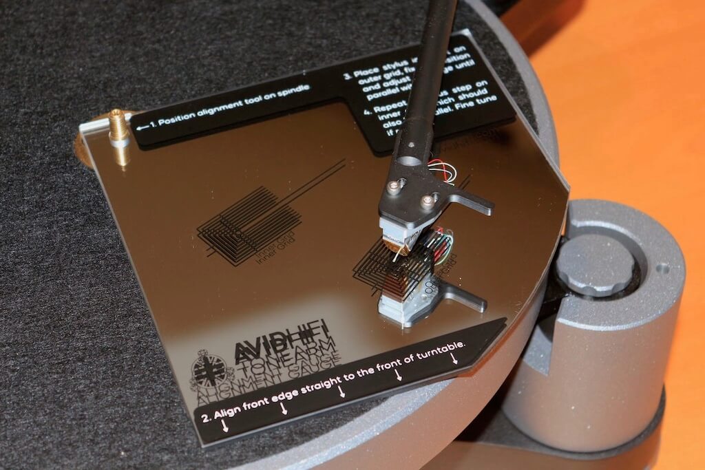 Pero con esto hemos dejado el plato montado. Ahora toca ajustarlo, lo que es muy sencillo: comprobar que la superficie del plato está bien plana (ajustando en caso contrario los pies) y comprobar, con la plantilla que nos regala AVID junto al manual, que brazo y cápsula están bien alineados. Ah, y otra cosa más: el contrapeso del brazo viene desmontado (así no se castigan sus rodamientos en el transporte, bien visto), toca montarlo y luego ajustar al peso de la cápsula. Para eso usé mi vieja y sencilla pero fiable báscula Shure, dejándolo en los 2’0 gramos recomendados. Es otra operación que me encanta, aunque tampoco extenta de ciertos nervios al implicar andar moviendo la aguja (¡me hago mayor supongo!).
