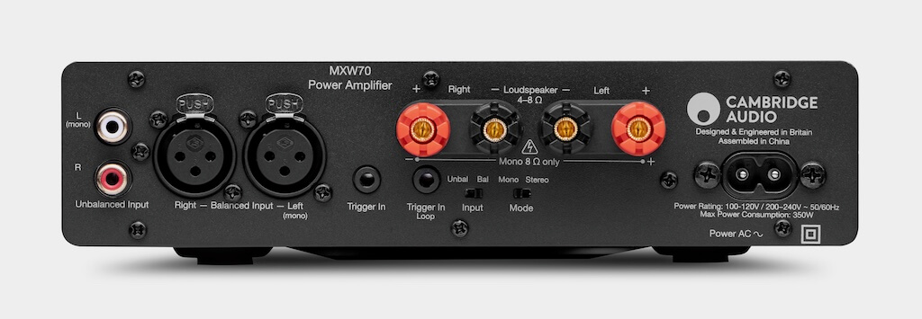 Concebida en el Reino o Unido y presentada en un embalaje muy bien pensado y ejecutado, sin lujos pero efectivo, la protagonista del presente banco de pruebas es minimalismo en estado puro a nivel formal, sin que por ello renuncie a la calidad ni a elementos identitarios de Cambridge Audio como son la construcción íntegramente metálica con mecanizados de alta precisión y la terminación en el característico “Lunar Grey”, aspectos ambos que comparte con los que oficiosamente son sus “compañeros naturales”, léase el antes citado reproductor de música en red MXN10 y el procesador digital de audio con amplificador de auriculares incorporado DacMagic 200M. Pero que nadie se engañe, porque cuando pasamos al panel posterior de la MXW70 nos damos cuenta enseguida de que su versatilidad es superior a la que cabría esperar en un producto tan asequible porque no sólo incluye un juego de entradas de línea balanceadas junto a sus homólogas no balanceadas y dos entradas -una directa y otra para enrutado a fin de facilitar la conexión encadenada a una segunda etapa o a otro dispositivo compatible- para señal de disparo de 12 V de corriente continua, sino también un par de pequeños conmutadores deslizantes que permiten seleccionar entre conexión balanceada y no balanceada y ¡atención! entre funcionamiento en estéreo o en mono. Bien asimismo por los terminales de conexión a cajas acústicas por cuanto permiten tanto el uso de cable pelado como de clavijas tipo cuchilla plana –“spade”- y bananas.