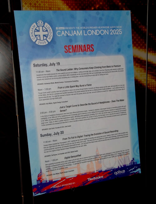 Teniendo como “sponsors” principales al servicio de música online Qobuz -convertido en una especie de estándar para los amantes del audio “Hi-Res” sin soporte físico- y la resucitada firma japonesa Technics, que, “con dos cojones”, fue la única que se atrevió a plantar un giradiscos en un entorno donde el protagonista absoluto, en lo que a fuentes se refiere, fue el streaming, CanJam London ofrecía además una propuesta de muy alto nivel para los aficionados más radicales. Me refiero a los seminarios que tenían lugar en dos espaciosas suites de la planta superior, y que, como no podía ser de otro modo, eran impartidos por auténticos expertos. Asistí a dos, ambos conducidos por Rob Watts, un veterano Consultor de Diseño Digital que, como se dice coloquialmente, “dominaba el tema”. Tenían por título “From a Little Spark May Burst a Flame” y “Digital Demystified” -dedicado a los distintos esquemas de conversión D/A existentes- y la verdad es que valió la pena estar allí aunque sólo fuera por conocer de primera mano el enfoque de un auténtico “insider” de la industria del audio digital. Había otros dos seminarios con buena pinta, pero a los que no tuve tiempo de asistir, titulados “Just a Target Curve to Describe the Sound of Headphones – Does That Make Sense?” y “From Tin Foil to Digital: Tracing the Evolution of Sound Recording”. A señalar asimismo el modesto, pero muy decente, catálogo del evento por cuanto en el mismo figuraban prácticas explicaciones sobre el qué y el porqué de las marcas asistentes.