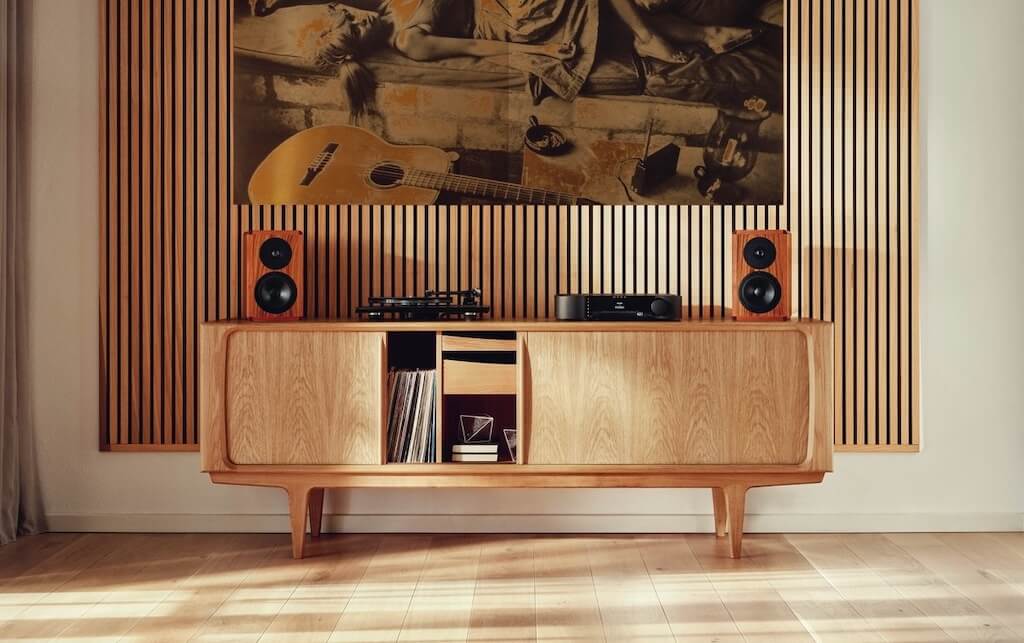 Puedes colocarlos sobre soportes como parte de un sistema que parezca un carrito de la compra en una tienda de alta fidelidad, por supuesto, pero también quedarán igual de bien —y sonarán igual de impresionantes— en una estantería o aparador. O conectados a un reproductor multimedia o a tu televisor. Puedes ponerlos boca abajo o incluso de lado, para que queden exactamente como tú quieras. Anímate a experimentar. Tienes nuestro permiso.