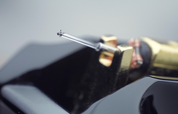 Una armadura de permalloy de carbono híbrido de 2 mm cuadrados, compuesta por un 78 % de níquel-hierro con infusión de carbono, se enrolla a mano con precisión con hilo de cobre de alta pureza 4N de 30 micras en la maquinaria patentada de Excel. Esta bobina móvil ultraligera tiene una salida de 0,3 mV a 5 ohmios.