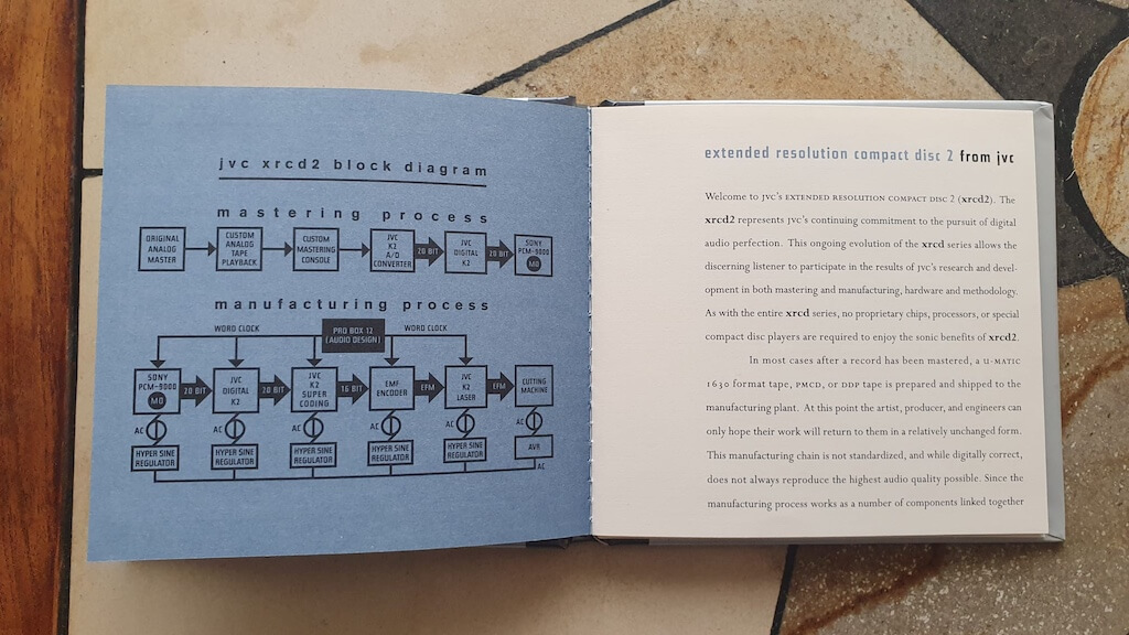 La guinda la ponen, como apuntaba al principio, los esquemas de postprocesado -masterización para ser exactos, a la vez que operativos únicamente con codificación PCM- de audio K2 y K2HD de JVCKENVOOD, siendo el primero de ellos un viejo conocido de los entusiastas del sonido absoluto más veteranos -entre los que ya me encuentro- que vio la luz por vez primera en la segunda mitad de la década de los 90’ en los cuidadísimos discos compactos “xrcd”, alias “extended resolución compact disc” de JVC y cuyo éxito se plasmó en versiones subsiguientes en sintonía con los progresos de la tecnología digital. Por ejemplo, los “xrcd2” utilizaban una versión del procesado K2 con tecnología de 20 bits… ¡sin comentarios! ¿Y qué hacen estos esquemas? Básicamente, “restaurar los armónicos naturales de la música”, una argumentación muy peregrina de la que hacen gala el grueso de sistemas de interpolación de audio mínimamente sofisticados que han ido apareciendo en las últimas tres décadas. Lo que marca la diferencia aquí es que el invento de JVC era verdaderamente serio al ser la firma nipona propietaria de uno de los estudios de grabación más reputados del Imperio del Sol Naciente, hasta el punto de que fueron varios los sellos discográficos de prestigio con vocación audiófila -TBM o FIM, por ejemplo- que lo adoptaron.