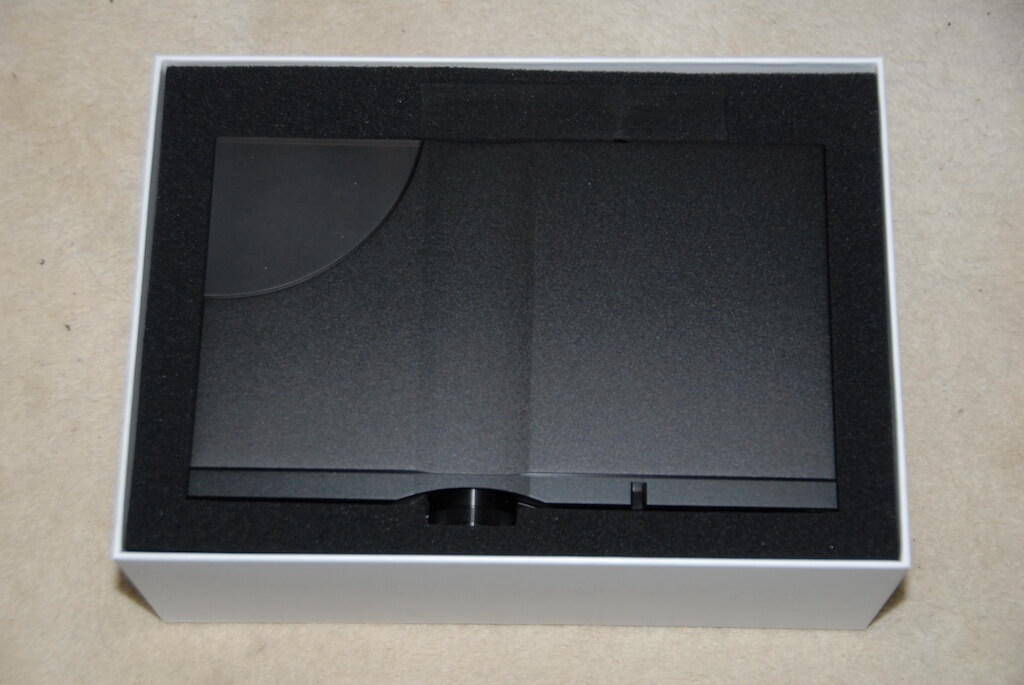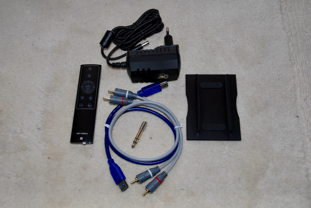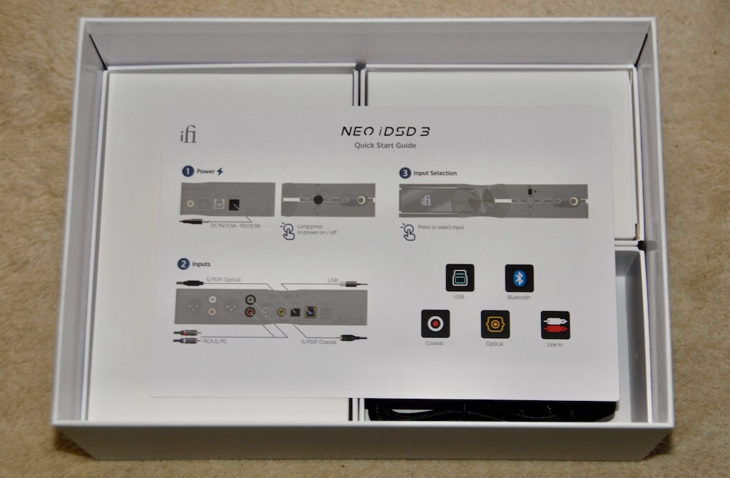 ¿Qué es lo que tenemos? De entrada, un embalaje impecable que recuerda al de un smartphone de alta gama, aunque a tamaño gigante. En el interior, el NEO iDSD rodeado por un protector de espuma compacta que es complementado por otro completamente separado que hace lo propio con los conectores del panel trasero, a su vez protegidos -RCA, TosLink- por tapones dedicados. Debajo, una práctica cartulina con ilustraciones para ayudar en la instalación y cuatro compartimentos albergan la fuente de alimentación y tres cajas con accesorios varios: desde cables de conexión analógicos (estereofónicos no balanceados) y digitales (USB-A a USB-B) hasta un pequeño mando a distancia, un adaptador para clavija de auriculares y la fuente de alimentación, sin olvidar una elegante base metálica para el caso de que queramos colocar el iFi Audio en posición vertical. Todo muy bien pensado, sí señor.