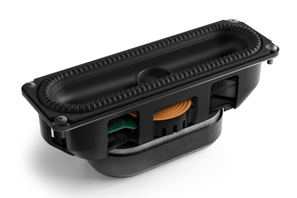 Y puesto que una imagen vale más que mil palabras, les invito a que echen un vistazo a la espectacular fotografía del despiece de la XIO que acompaña al presente banco de pruebas, así como las de los cortes esquemáticos de los altavoces que monta. Obviamente, hablar de KEF implica hacer referencia al emblemático transductor Uni-Q de la marca, que en nuestra invitada se encarga de reproducir, en una elaborada versión en miniatura llamada Uni-Q MX, los canales principales “frontales” -con una unidad extra para el crítico canal central situada en la superficie que los “3D” a fin de compensar pérdidas de fidelidad debidas a la colocación de la barra- y los correspondientes al sonido envolvente multidimensional. Por su parte, los canales de efectos tradicionales son confiados a dos altavoces “full range” del mismo tamaño. Mención especial merece la sección de graves, confiada a un total de 4 transductores con diafragma en forma de “circuito de carreras” –“racetrack”- y suspensión periférica ranurada P185 firmados por KEF, que, si la situación lo requiere o el usuario así lo desea, pueden complementarse con un subwoofer inalámbrico de la misma marca vía receptor inalámbrico KW2 RX opcional. De los P185 habría que destacar especialmente una astucia de ingeniería que incorporan: el exclusivo sistema VECO (“Velocity Control Technology”), que monitoriza el movimiento del cono en tiempo real y corrige cualquier desviación, minimizando drásticamente la distorsión. Otro detalle que refleja el alto grado de refinamiento técnico de la XIO es que los 12 transductores que incorpora son excitados por amplificadores -en Clase D- independientes.