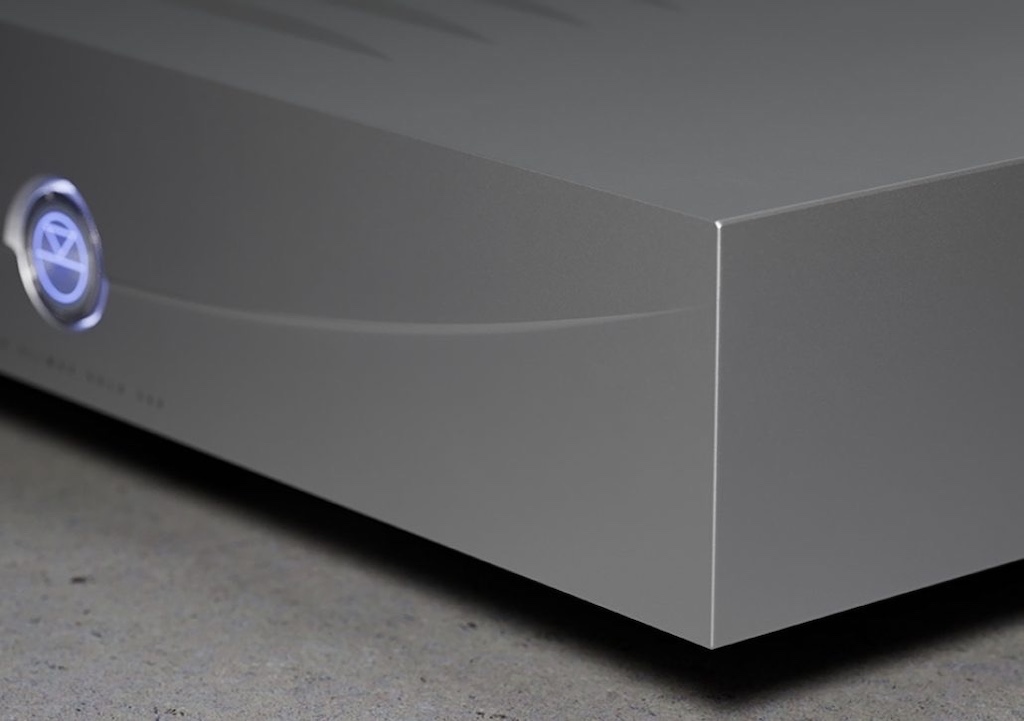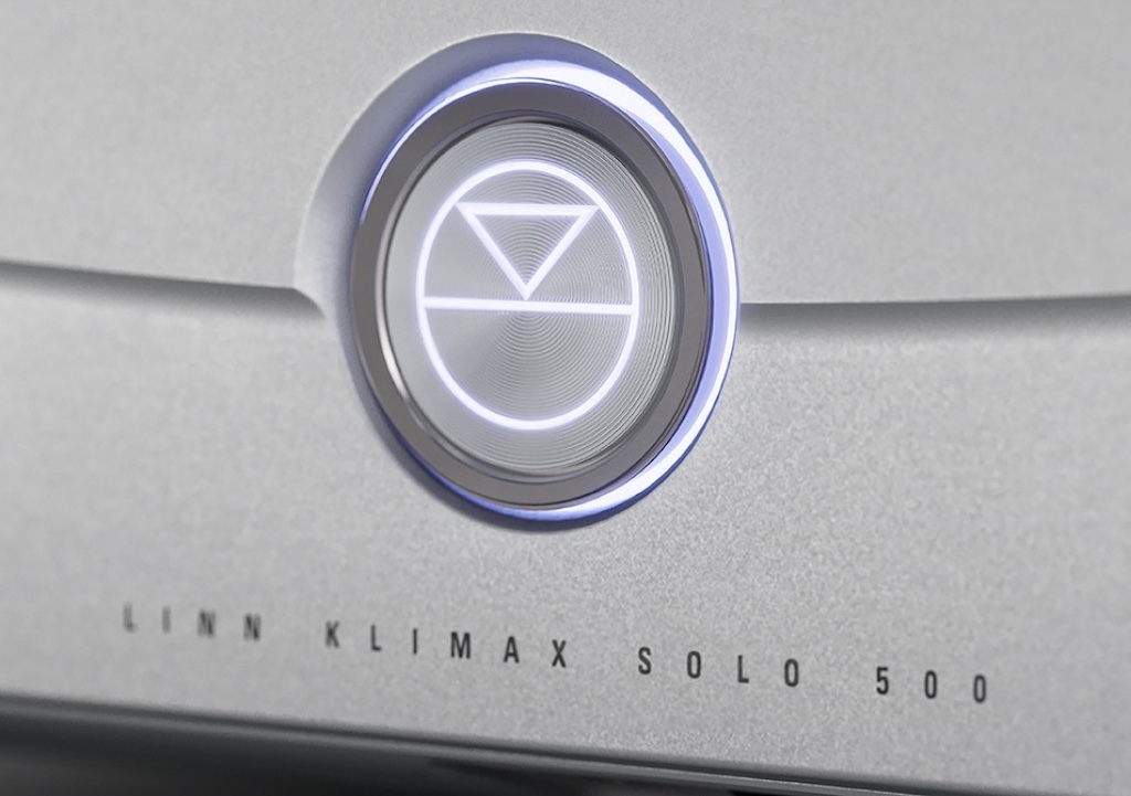 Un corte de filete variable en el aluminio crece hacia un borde biselado y una llamativa pieza central: una insignia Linn retroiluminada en el centro de un círculo en miniatura, con un borde cromado con ranuras radiales y un anillo exterior de acero. El conjunto de la insignia tiene profundidad, reflejando la luz dinámicamente al ser visto desde diferentes posiciones. Cada amplificador del sistema refleja la luz y crea sus propias sombras, lo que contribuye a la estética distintiva y con carácter del Solo 500.
