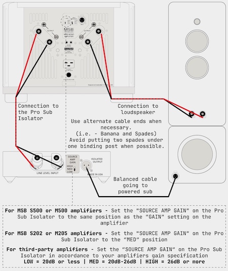 La entrada del Pro Sub Isolator cuenta con un conjunto de bornes de conexión para altavoces que se pueden conectar mediante conectores banana o de horquilla directamente a la salida de su altavoz o amplificador de potencia. Recomendamos usar los conectores de estilo alternativo de su sistema actual. No apile conexiones de horquilla bajo un mismo borne de conexión. El Pro Sub Isolator consume muy poca energía de la señal de nivel de altavoz, por lo que se puede usar un cableado ligero en lugar de interconexiones de altavoces de alta potencia. Los cables para audiófilos suelen ser voluminosos, por lo que diseñamos las patillas de entrada con rotaciones indexables para ajustar el ángulo en el que se conectan las patillas a la unidad. Para configurar el suyo, contacte con su técnico local o directamente con MSB.