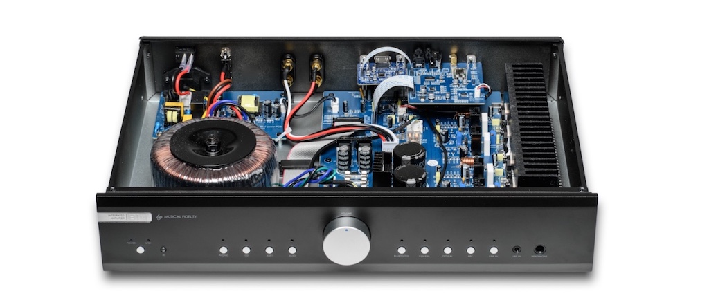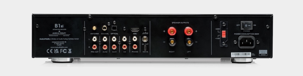 Unos registros debidos en gran parte a una generosa fuente de alimentación lineal presidida por un robusto transformador toroidal y condensadores de grado audiófilo configurada en la mejor tradición de Musical Fidelity. También la sección de preamplificación ha sido objeto de un especial esmero en su concepción y ejecución, incluyendo su subsistema de alimentación dedicado, toda una rareza en los diseños integrados. Esta estrategia garantiza un silencio de funcionamiento sensacional y una excelente separación entre canales, pudiendo equiparse a conjuntos formados por preamplificador y etapa de potencia independientes. Por su parte, el control de volumen es confiado a un potenciómetro analógico excitado por un motor que, al contrario que muchos de sus equivalentes digitales modernos (que comprometen la fidelidad debido a pérdidas en la resolución), preserva la pureza del contenido tratado. Tampoco los amantes del vinilo quedarán defraudados con el B1xi, gracias a una etapa de fono de alta ganancia (para cápsulas de imán móvil/MM) y, en consonancia con el resto de la circuitería, un ruido de fondo ultrabajo.