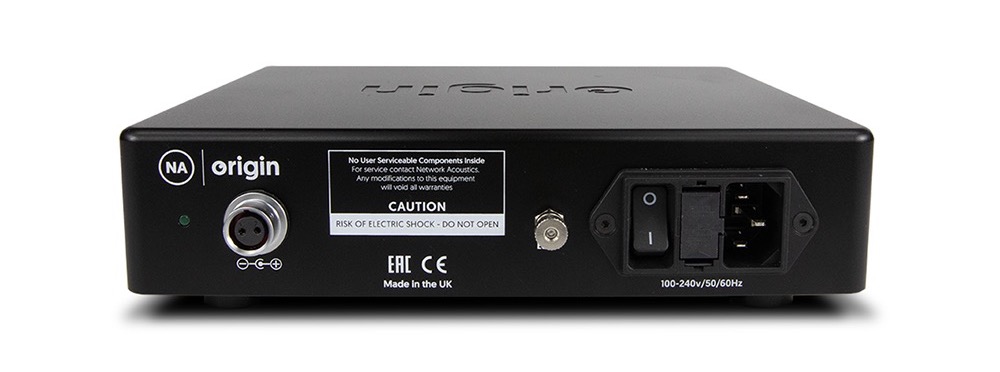 Diseñada artesanalmente en el Reino Unido, Origin está disponible en dos versiones (5 V/3,5 A y 12 V/3,0 A) y se vende de serie con el cable de alimentación CC Reference de 1,00 metros de Network Acoustics, con conector cilíndrico de CC de 2,1 mm o 2,5 mm.