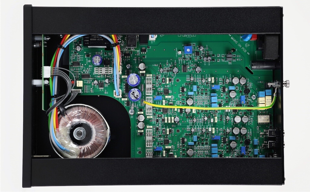 El chasis de aluminio actúa como blindaje frente a interferencias externas (RFI), protegiendo la delicada señal procedente de la cápsula MC, cuyo nivel de salida es extremadamente bajo y especialmente sensible a contaminaciones electromagnéticas.