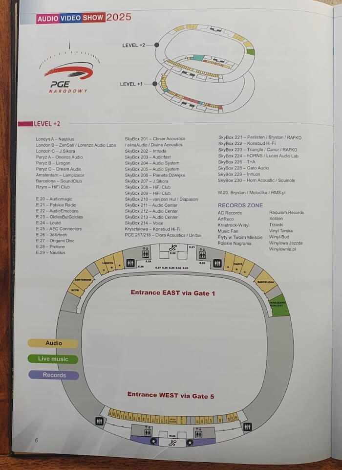 Entrando ya en el certamen propiamente dicho, lo primero que hay que decir es que, al igual que algunos CES (Consumer Electronics Show) del pasado y mis añoradas -la edición de 1990 fue brutal- “Journées de la Haute Fidelité”, estaba dividido en varios espacios, lo que introdujo una cierta componente de incomodidad logística que fue debidamente compensada, al menos para los asistentes, con el infalible “sarna con gusto no pica”, y en lo práctico, con esa lanzadera a la que antes he hecho referencia y que unía el espacio principal con el más grande de los espacios secundarios, estando el tercero a tiro de piedra de este último. ¿Y cuáles eran dichos espacios? El principal era nada menos que el PGE Narodowy “Estadio Nacional de Varsovia”, un moderno estadio de fútbol inaugurado en enero de 2012, siendo los “secundarios” los hoteles Radisson Blu Sobieski y Golden Tulip. Me impresionó al respecto el uso que se le puede dar a un estadio más allá de sus usos deportivos principales y los conciertos multitudinarios. En concreto, el Audio Video Show 2025 en repartía en dos plantas de los sectores este y oeste -sus homólogas norte y sur no estaban ocupadas- mientras que la entrada principal, de hecho la “oficial” del evento, estaba en la entrada oeste de la planta -3, a pie de calle pese a lo que pueda sugerir el número en cuestión.