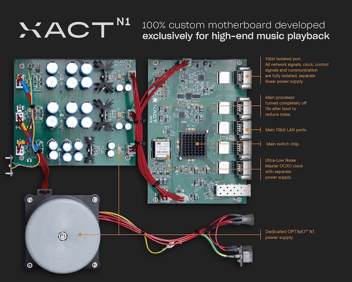 Mientras que muchos de los llamados switches «audiófilos» son dispositivos de grado informático rebautizados con pequeñas modificaciones, el XACT N1 establece un nuevo estándar al rechazar por completo este enfoque. Cuenta con una placa base totalmente personalizada, regulación lineal de ruido ultrabajo para cada circuito y una fuente de alimentación lineal dedicada, todo diseñado con un único objetivo: preservar la pureza del sonido en cada paso de la cadena de señal.